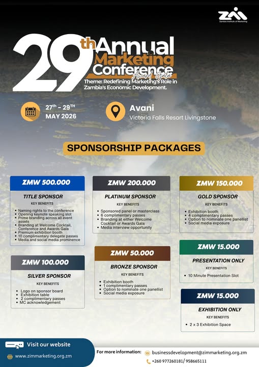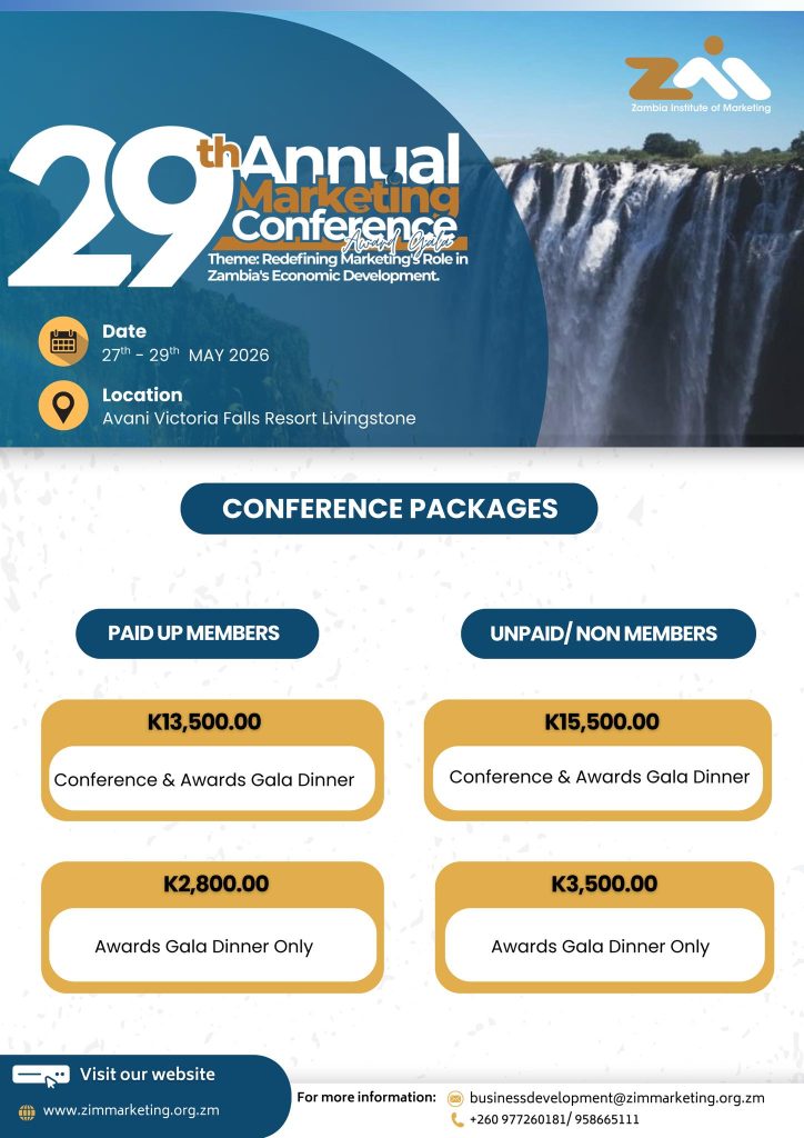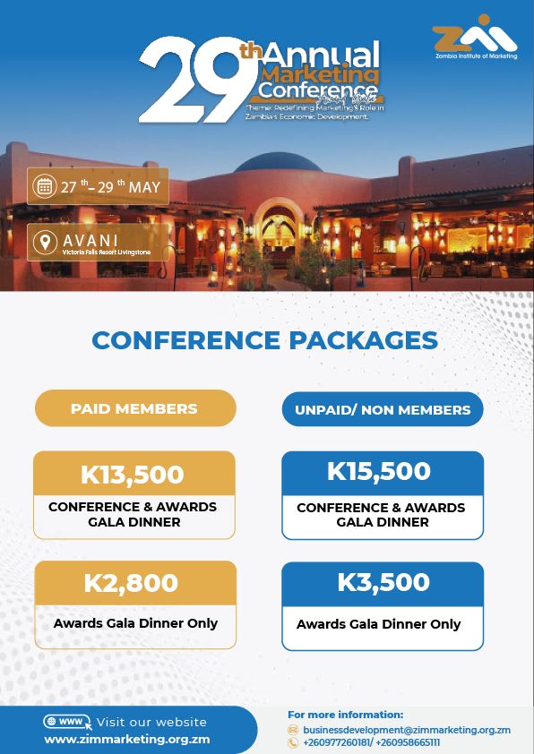 Conference Participation And Sponsorship ANNUAL MARKETING CONFERENCE PARTICIPATION & SPONSORSHIP https://www.zimmarketing.org.zm/wp-content/uploads/2026/04/amc-2026-vid-2.mp4 Conference Starts in: Pre-Registration Conference Speakers Nominations for Awards Conference Topics Participation & Sponsorship Voting Last Year's Winners FAQs Conference Evaluation