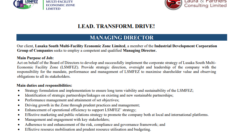 Read MoreLusaka South Multi-Facility Economic Zone Limited, a member of the Industrial Development Corporation Group of Companies seeks to employ a
