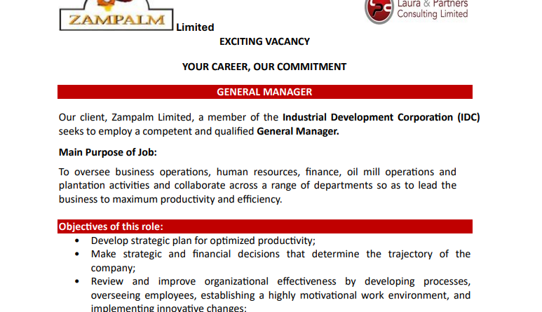 Read MoreZampalm Limited, a member of the Industrial Development Corporation (IDC) seeks to employ a competent and qualified General Manager. Applications